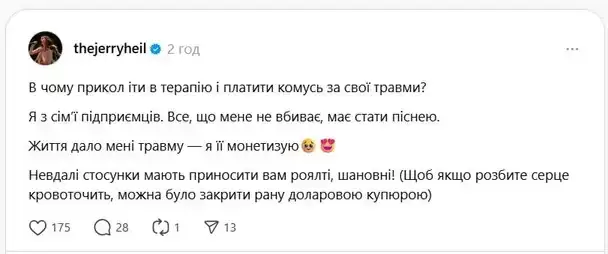 У Threads артистка написала, що не бачить сенсу витрачати гроші на терапію й ділитися з психологом власними травмами. Натомість, переконана Jerry Heil, будь-який біль чи невдача мають перетворюватися на творчість. Також співачка додала, що “рани” від невдалих стосунків можна закрити хоча б грошима, щоб була хоч якась користь.