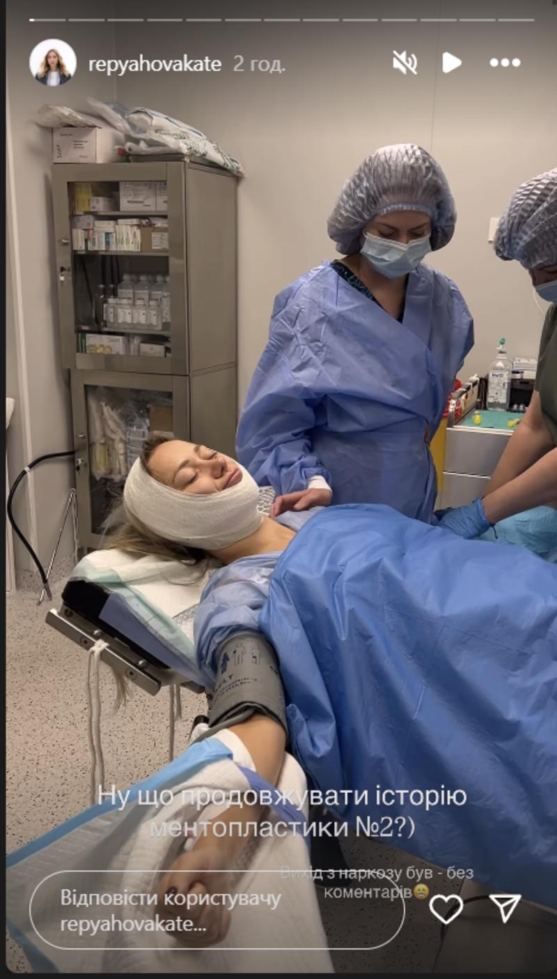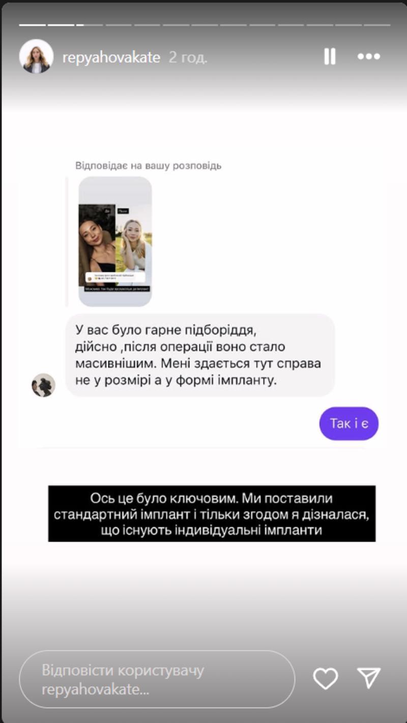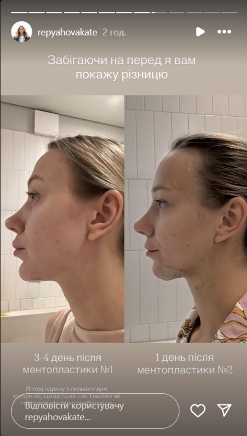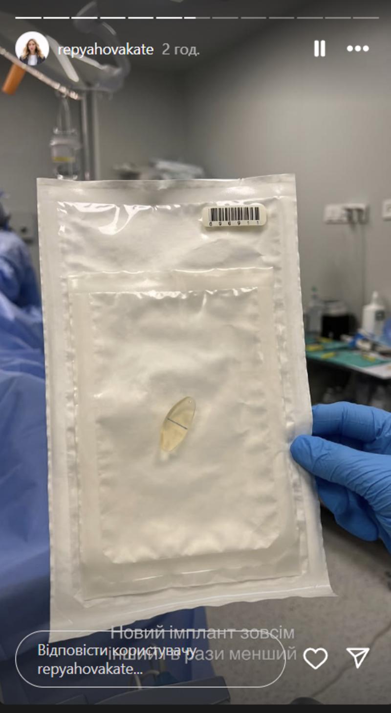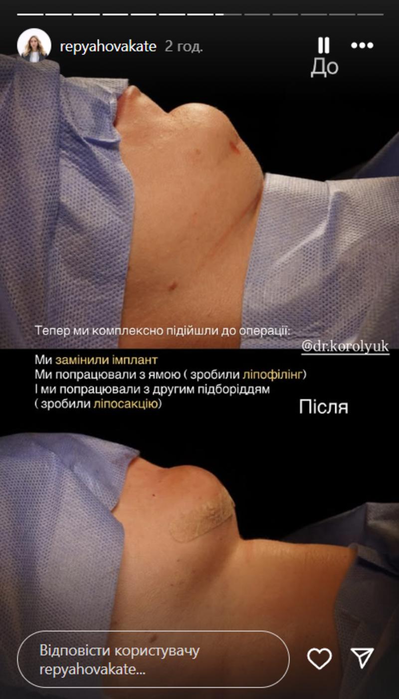 Окрім заміни імпланту, Репяхової зробили ліпофілінг (заповнення ямки) та ліпосакцію другого підборіддя. За словами дівчини, реабілітація пройшла легко та безболісно. Вона зазначила, що це була її четверта та остання пластична операція.