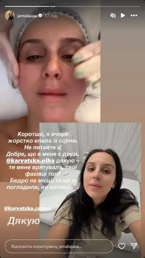 «Жорстко впала зі сцени…Не запитуйте…Добре, що в мене є друзі. Олю, дякую, ти мене врятувала, твої фахівці – топ! Стегно на місці, та ще й погладили, як котика», – поділилася Джамала зі своїми підписниками.
