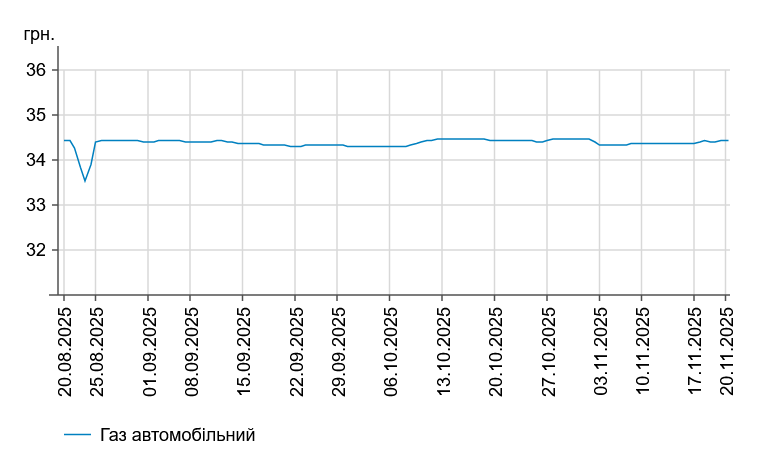 Зокрема, зафіксовано такі середні ціни на пальне: бензин марки А-95 (преміум) — 62,57 грн/л (здешевшав на 75 коп.); бензин марки А-95 — 58,52 грн/л (здорожчав 1 коп.); бензин марки А-92 — 56,76 грн/л (здорожчав на 3 коп.); дизельне пальне — 58,39 грн/л (здорожчало на 6 коп.). Середня ціна автогазу становить 34,44 грн/л — на 3 коп. більше, ніж попереднього дня.