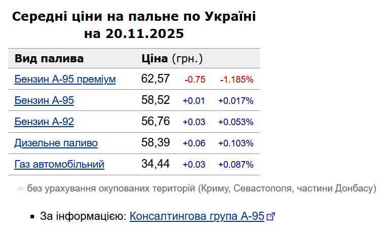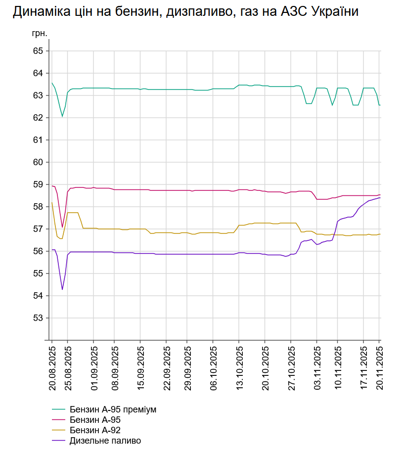Як повідомлялось, у середу, 19 листопада, середня ціна на бензин марки А-95 залишилася на рівні 58,51 грн/л, на дизельне пальне — зросла на 7 коп. до 58,33 грн/л.