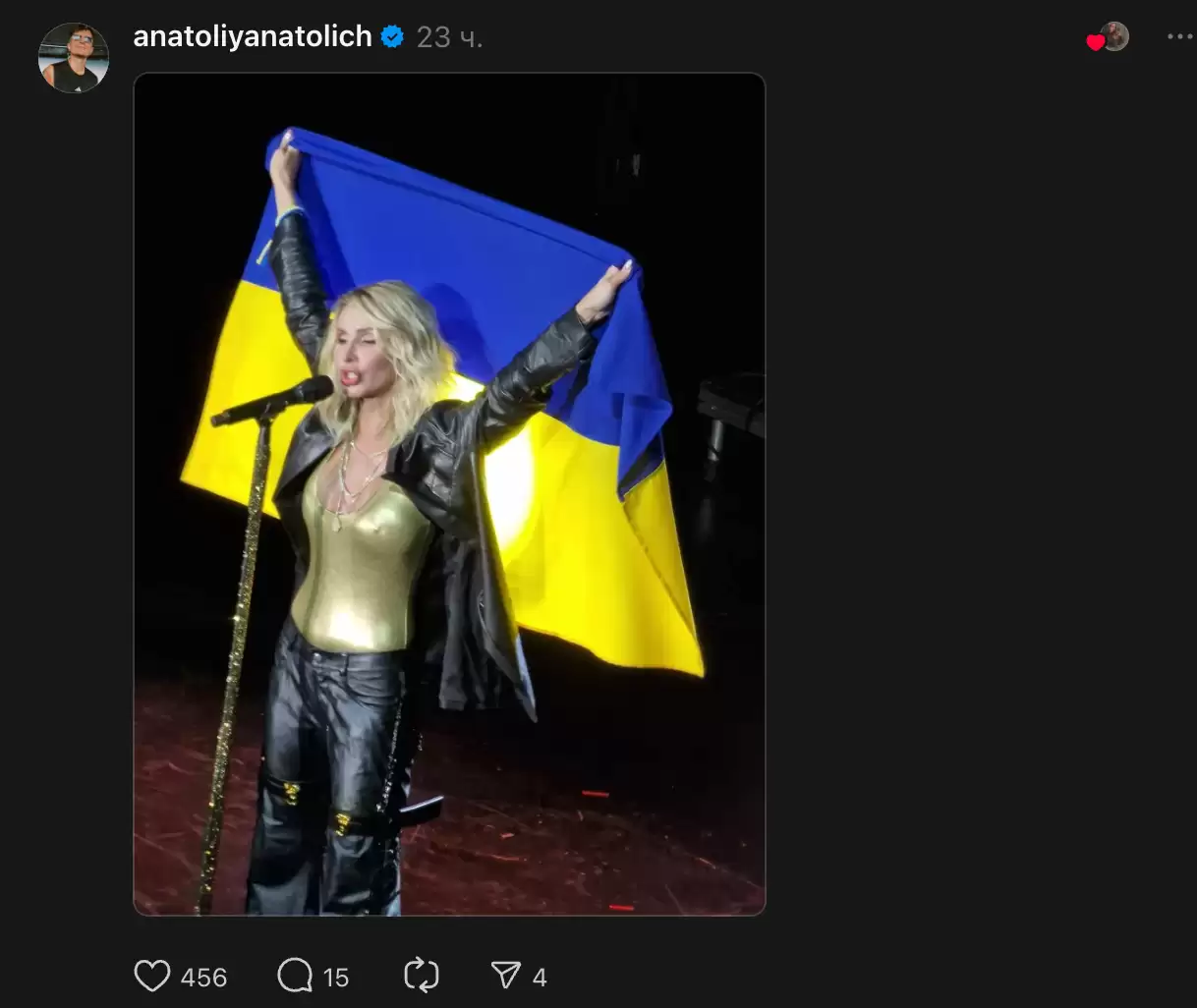 Цікаво, що заступитись за Світлану Лободу у коментарях прийшов і кум виконавиці – Анатолій Анатоліч. Він опублікував фото, де співачка триває розгорнутий український прапор над головою. Та це було ще у 2023 році, коли зірка презентувала україномовний альбом.