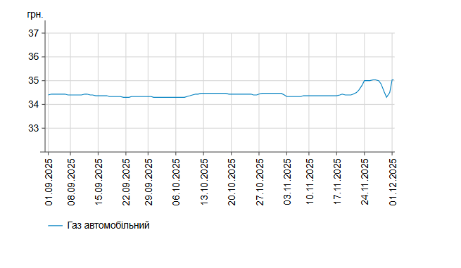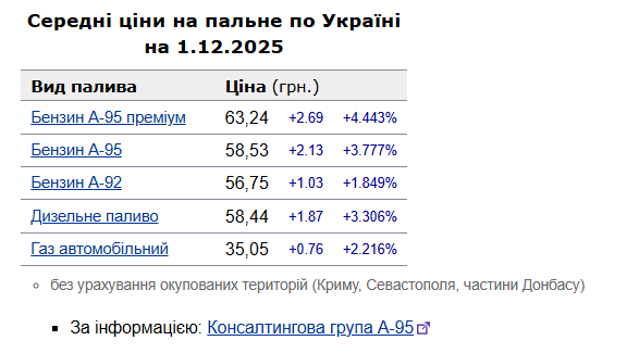Зокрема, зафіксовано такі середні ціни на пальне: бензин марки А-95 (преміум) — 63,24 грн/л (здорожчав на 2,69 грн); бензин марки А-95 — 58,53 грн/л (здорожчав на 2,13 грн); бензин марки А-92 — 56,75 грн/л (здорожчав на 1,03 грн); дизельне пальне — 58,44 грн/л (здорожчало на 1,87 грн). Середня ціна автогазу становить 35,05 грн/л, що на 76 коп. більше порівняно із попереднім робочим днем — 28 листопада.
